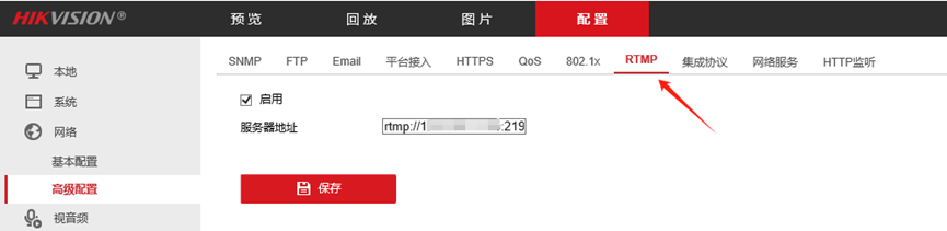 3、在摄像机(海康)【高级配置】-【RTMP】中勾选【启用】,在【服务器地址】中填写复制的推流地址,点击确认。