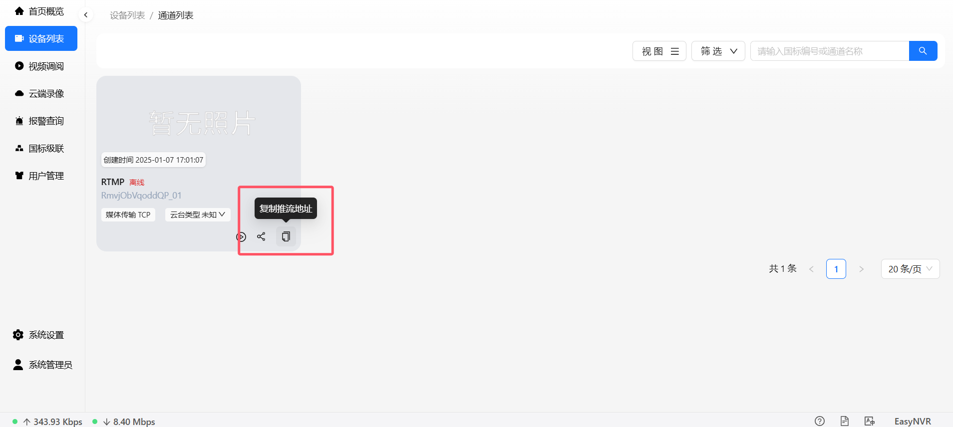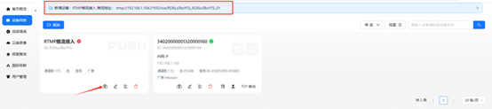 2、创建RTMP设备后,平台页面上方会提示新增设备的推流地址,可以直接复制使用;或进入该设备的通道列表,复制推流地址;