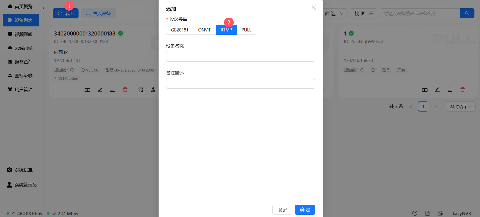 1、在EasyNVR平台【设备列表】菜单,点击添加按钮,"协议类型"选择RTMP,输入名称后点击确定;