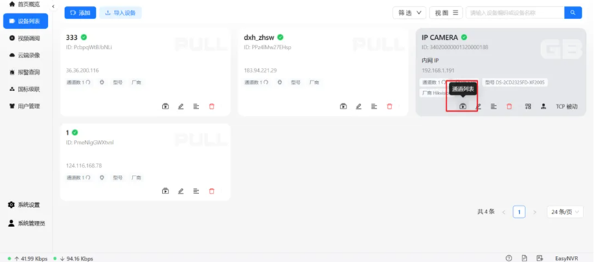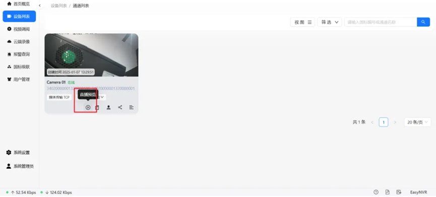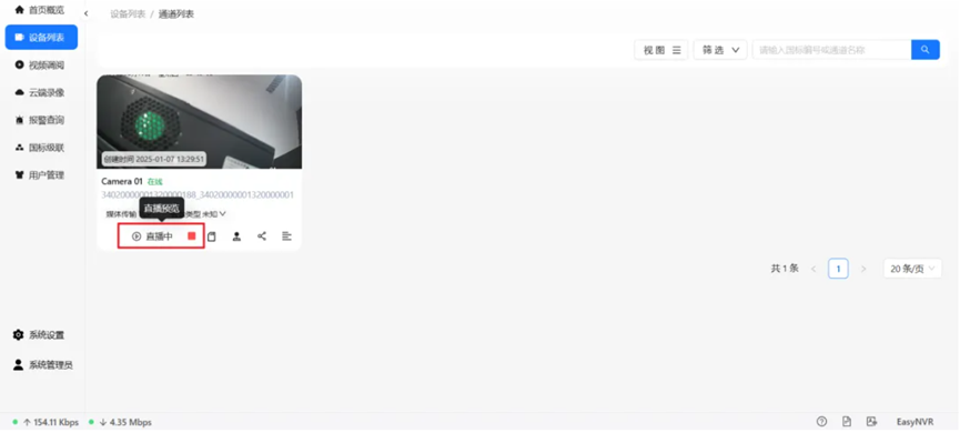 接着,前往【设备列表】页面,选取一个当前在线的设备,并点击进入其【通道列表】。在通道列表中,选择【直播预览】以查看视频流,随后关闭视频预览窗口,但请注意,此时直播并未停止。