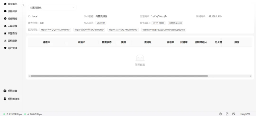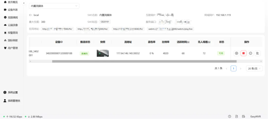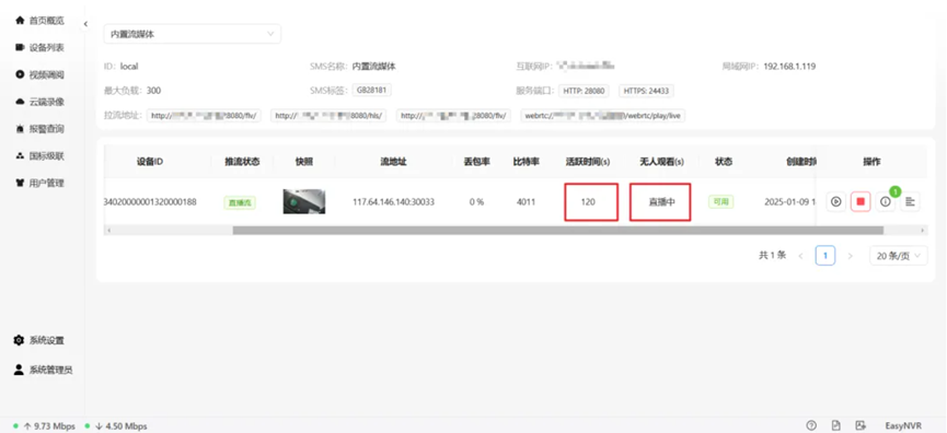 然后,再次进入【系统设置】,并点击【推流列表】。在此列表中,您可以观察到,在无人观看的情况下,视频流的活跃状态将在70秒后自动结束,即视频流被关闭。