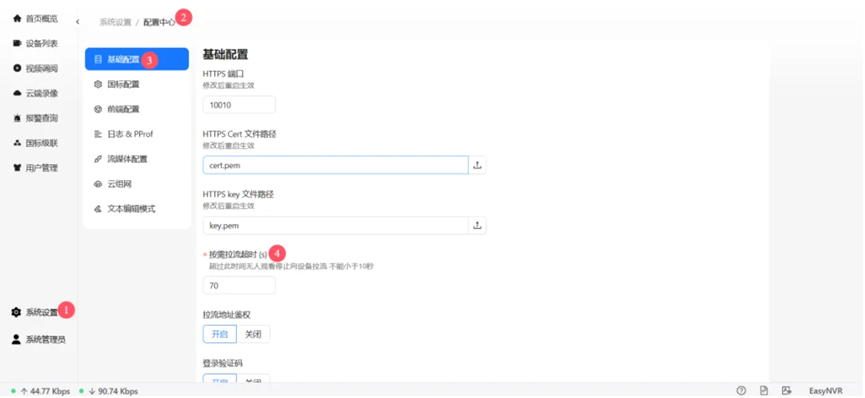 首先,登录至EasyNVR平台,依次点击【系统设置】-【配置中心】-【基础配置】,在此处找到【按需拉流超时】配置项,并将其时间设定为70秒,随后点击保存以应用此设置。