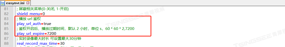 该地址为直播流地址鉴权,为播放时效,支持用户自定义直播流的时长。在EasyNVR安装包根目录easynvr.ini文件中,将 play_url_auth设为true,即可配置鉴权时效,如下所示,数值7200为视频单次播放时长(2小时);
