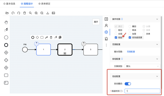 为了工单挂起不再随意,新增加了时间限制,在流程设计-节点设置,设计人在勾选挂起后增加挂起配置,可以设置“自动重启”。设置节点自动重启的挂起时间,以小时为单位。工单在该节点挂起后进入挂起计时,重启、再挂起后计时会累积,直到累积时间达到设置的挂起时间后该节点便不再允许挂起。当节点通过或驳回后,该计时会清零。