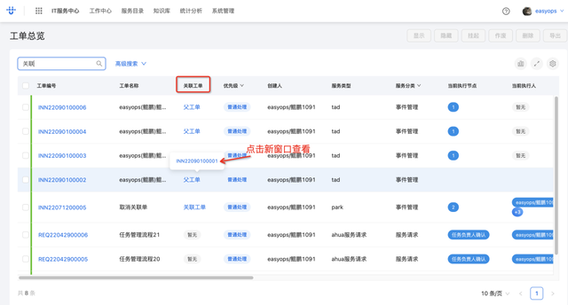 为了提高用户效率,增加了关联工单列,展示该工单的关联工单、父工单和子工单。鼠标上移会显示对应的工单编号,点击转跳即可。
