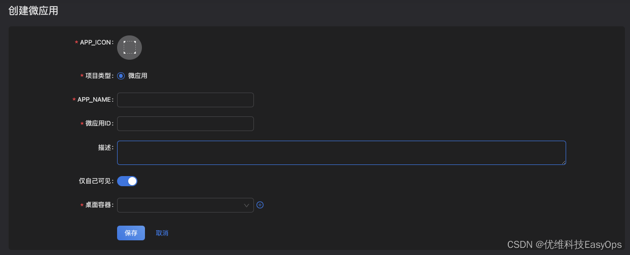 点击右上角的新建按钮,填写微应用的基本信息,点击保存即创建成功;创建成后,系统将自动为您跳转到该新建微应用首页。