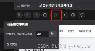 *tips:构件修改后,只会在当前预览画布生效,如若想预览环境也生效的话,记得点击处于顶部工具栏的Build&Push按钮,另外此功能也支持定时推送功能,默认为30s推送一次,当然,你可以通过手动点击,处罚推送,或者将推送间隔时间修改为: -1, 这样此功能就变为纯手工推送啦!
