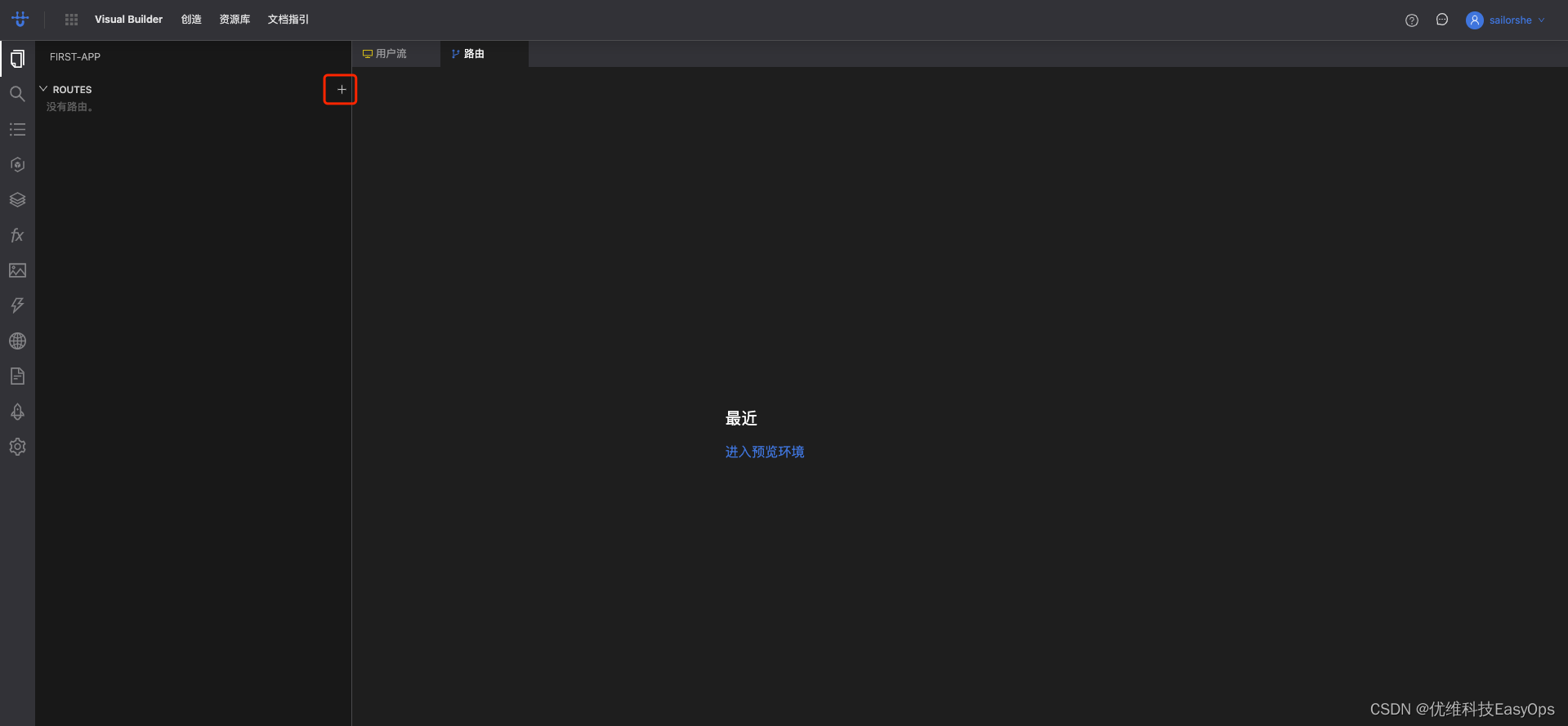 将鼠标移入Route面板,在面板上方会出现 + 图标, 点击图标, 弹出添加路由弹窗, 填入具体信息, 就会为您创建第一个页面了!
