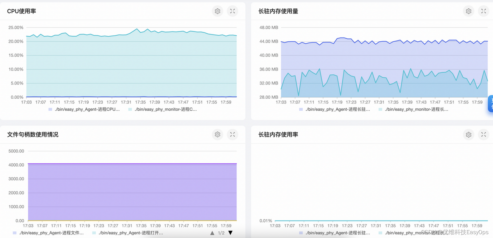 - 性能监控:顾名思义,是监控进程的运行性能的,监控数据一般是时间序列数据,拥有鲜明的趋势变化的特点,一般指进程的CPU,内存,文件描述符等指标;