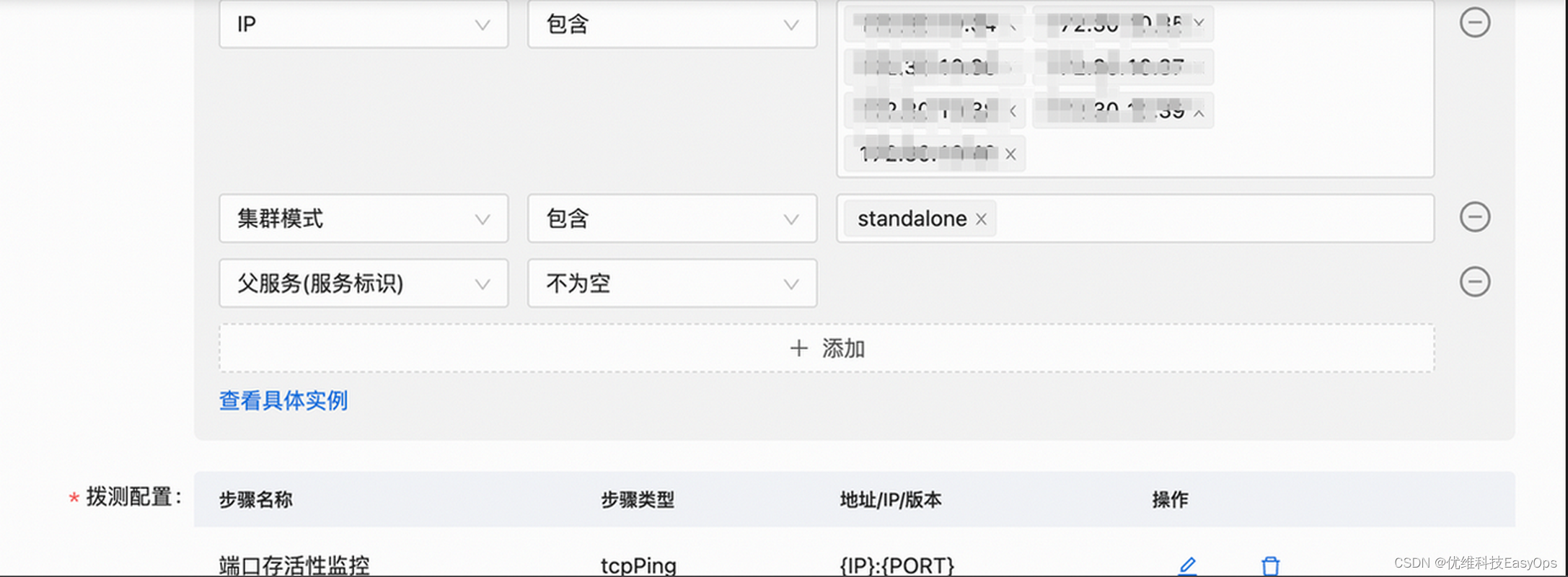 - 集群模式包含standalone,并且父服务不为空,表示监控服务上的子服务类型。由于我们的拨测目标需要具体到IP:PORT,因此仅针对子服务拨测。