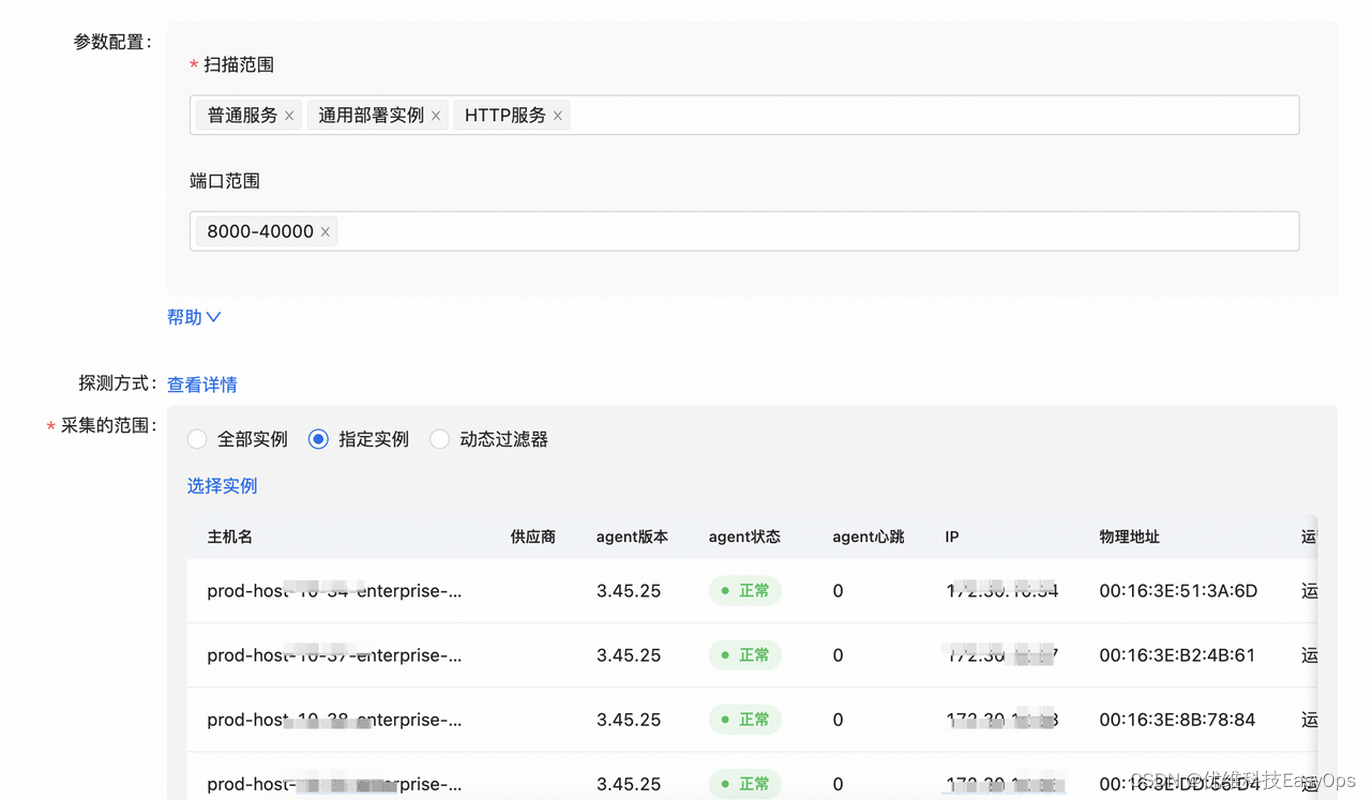 首先,我们需要配置部署实例的发现策略,在资源自动发现中,配置【通用部署实例】的自动发现策略,扫描范围填写普通服务,通用部署实例和HTTP服务,也可以选择如Nginx部署实例,tomcat部署实例等类型,此时会把部署实例以及其承载的服务一并发现上来,并建立关联关系。而后,选择要发现进程的端口范围和主机即可。