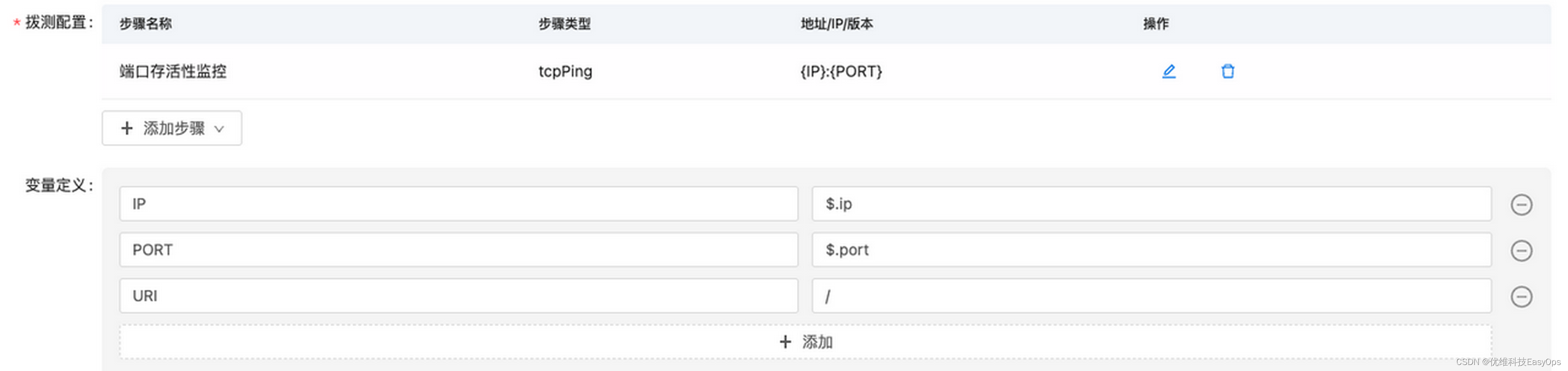 - 通过定义变量的方式获取要拨测的IP:PORT,注意选择tcpPing的步骤类型
