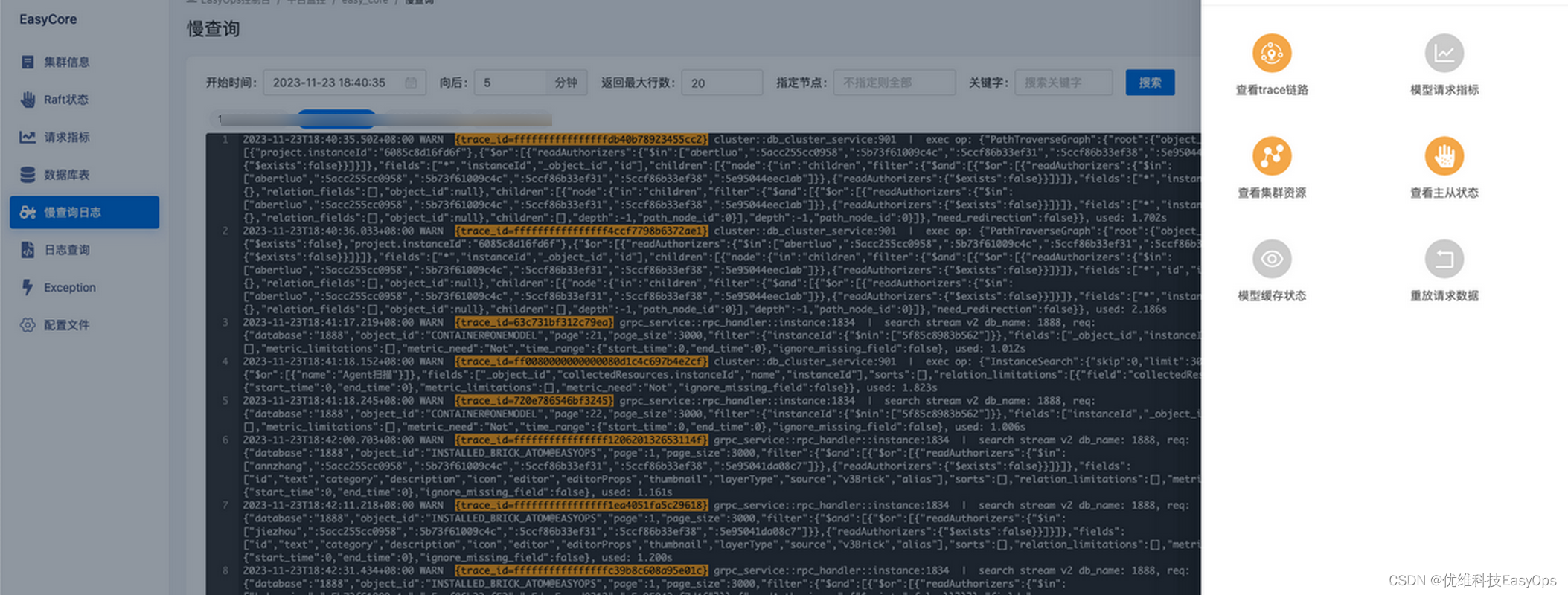 慢查询日志、日志查询、Exception分别提供页面查询easy_core的slowlog、log、err日志 ,选中日志中高亮的traceId时会弹出trace追踪工具,可以跳转到链路追踪查看请求路径。