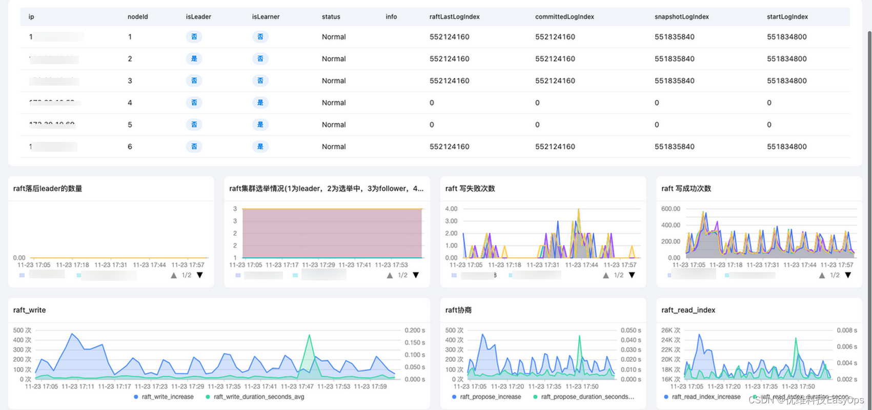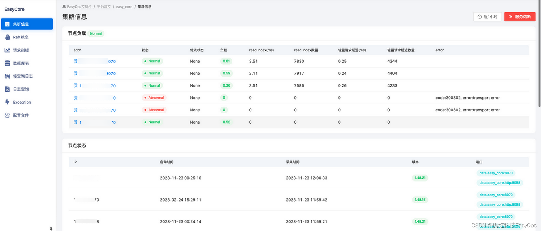 Raft状态:展示easy_core集群Raft选举的情况,其中如果发现集群leader经常切换、raft常态落后于leader,这就表明集群是有异常的,可以通过日志进一步定位。