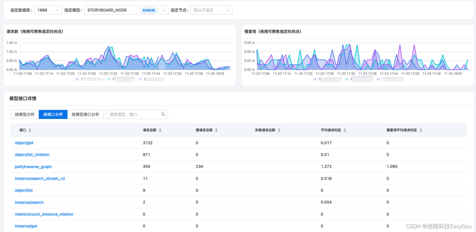 请求指标:用于跟踪easy_core请求定位,按ORG、模型、接口、节点展示模型的请求次数、慢查询平均延时。当页面请求cmdb返回较慢时,可以检查该指标情况。