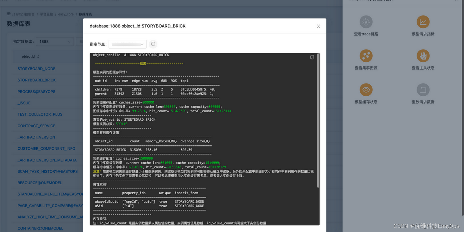 数据库表: 可以查看各ORG中各模型的实例数,配合分析工具箱中的工具可以定位模型的缓存命中情况、请求指标。