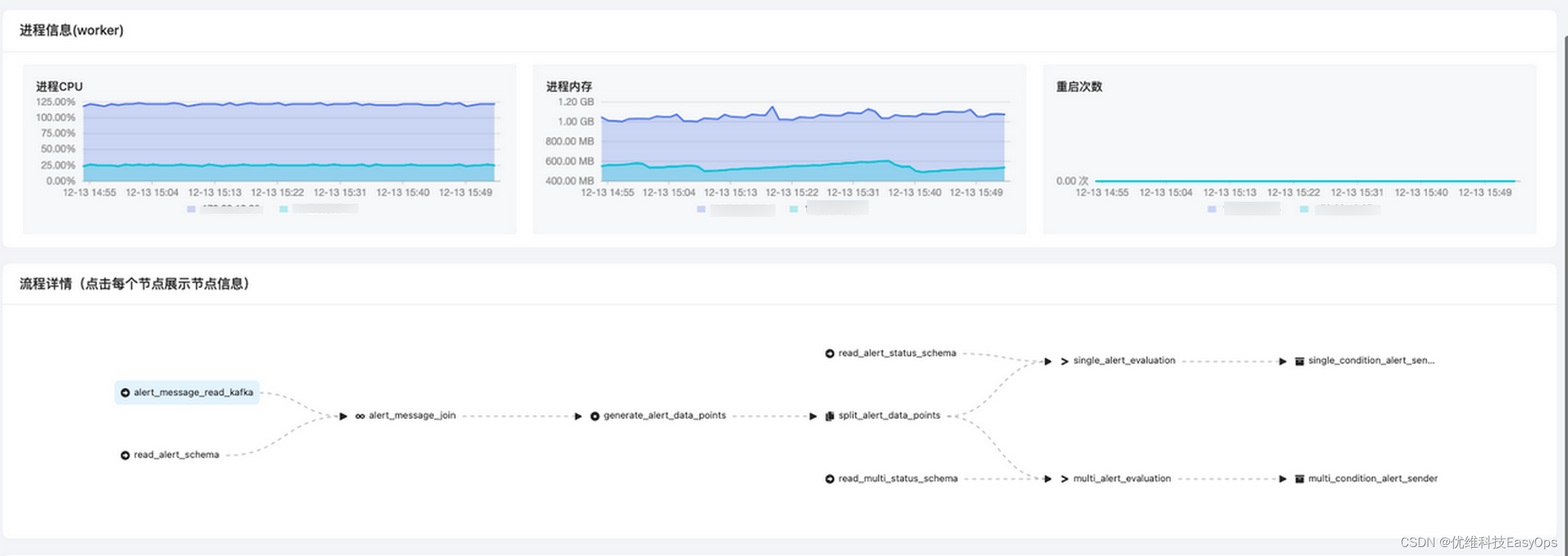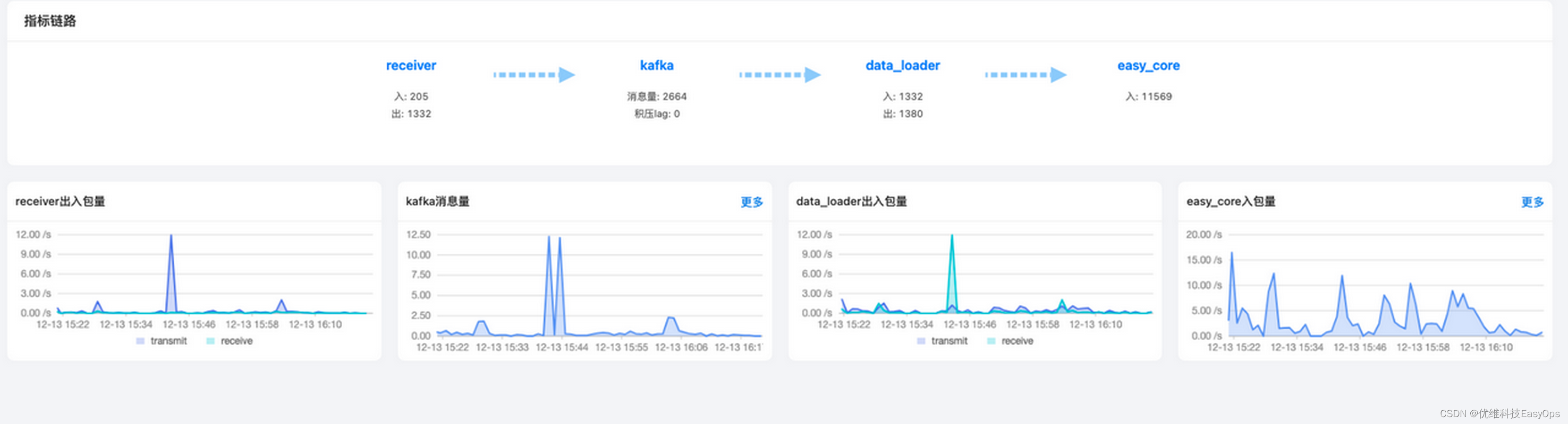 当我们发现监控平台大部分dashboard都出现断点或无数据的情况时,我们可以先查看该数据链路,查看各个节点的出入包量,如果发现某一个环节不断在累积,则可以定位是下一个节点出现了异常,没有消费,点击右上角的更多跳转到组件的详细页面查看。图中呈波浪状的情况是正常的,原因是raw_metric_process是批量消费kafka,再批量入库的,只要积压量不是随时间成正比增长,数据链路就是正常的。