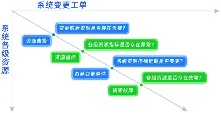 通过掌握以上两个维度的信息,横向上从系统变更工单的视角出发,通过变更工单可查看系统本身服务是否有告警,服务当前的健康指标状况,以及之前是否有故障工单的存在。同时,纵向上可查看系统各级资源,如各种中间件、数据库、存储等资源是否有告警,是否有做过变更,及资源当前是否存在故障。