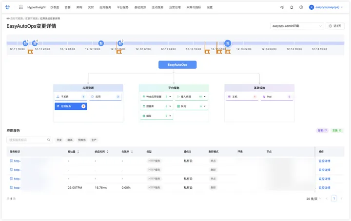 - 健康态势评估:帮助业务运维/系统运维了解变更后系统是否存在异常,多次变更之间是否存在相互影响,融合系统资源图谱、资源告警及其他事件来得到一个关于变更后系统健康态势的准确评估。