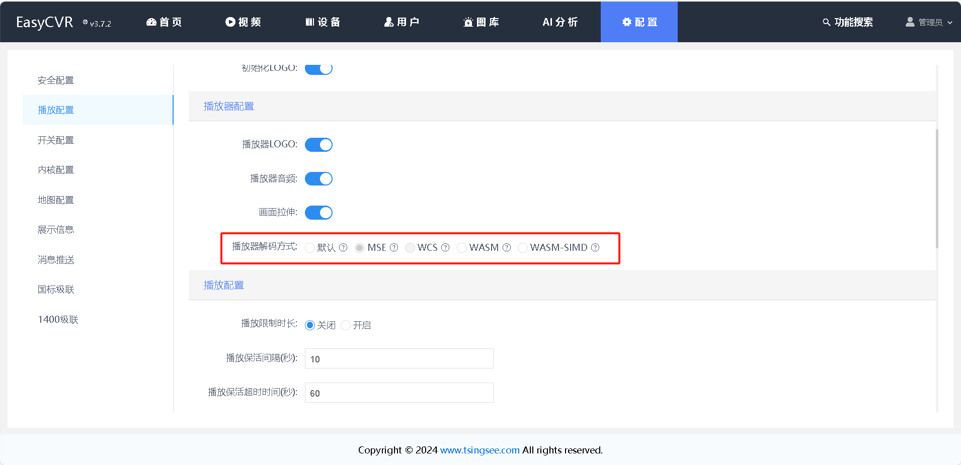 EasyCVR v3.7.2版本支持更改播放器解码方式,进一步优化了用户的播放体验,而其强大的协议支持、多流输出及录像存储等核心功能,更是为视频监控、视频播放等场景提供了坚实的技术支撑。用户通过本方案完成默认播放器配置,结合平台丰富功能,能够充分挖掘视频汇聚平台EasyCVR的潜力,实现更高效、智能的视频管理与应用,满足不同业务场景下的多样化需求。