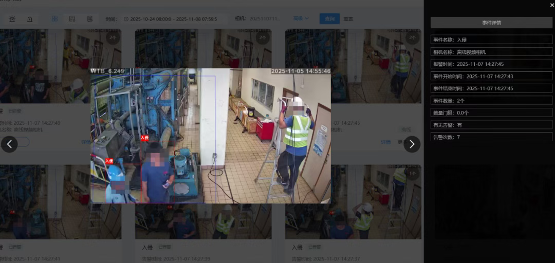 二是赋予系统真正的“智能”,通过加载多种AI算法,自动识别区域入侵、安全规范(如安全带/安全帽佩戴)、烟火等风险行为,实时抓拍与告警,形成管理闭环。