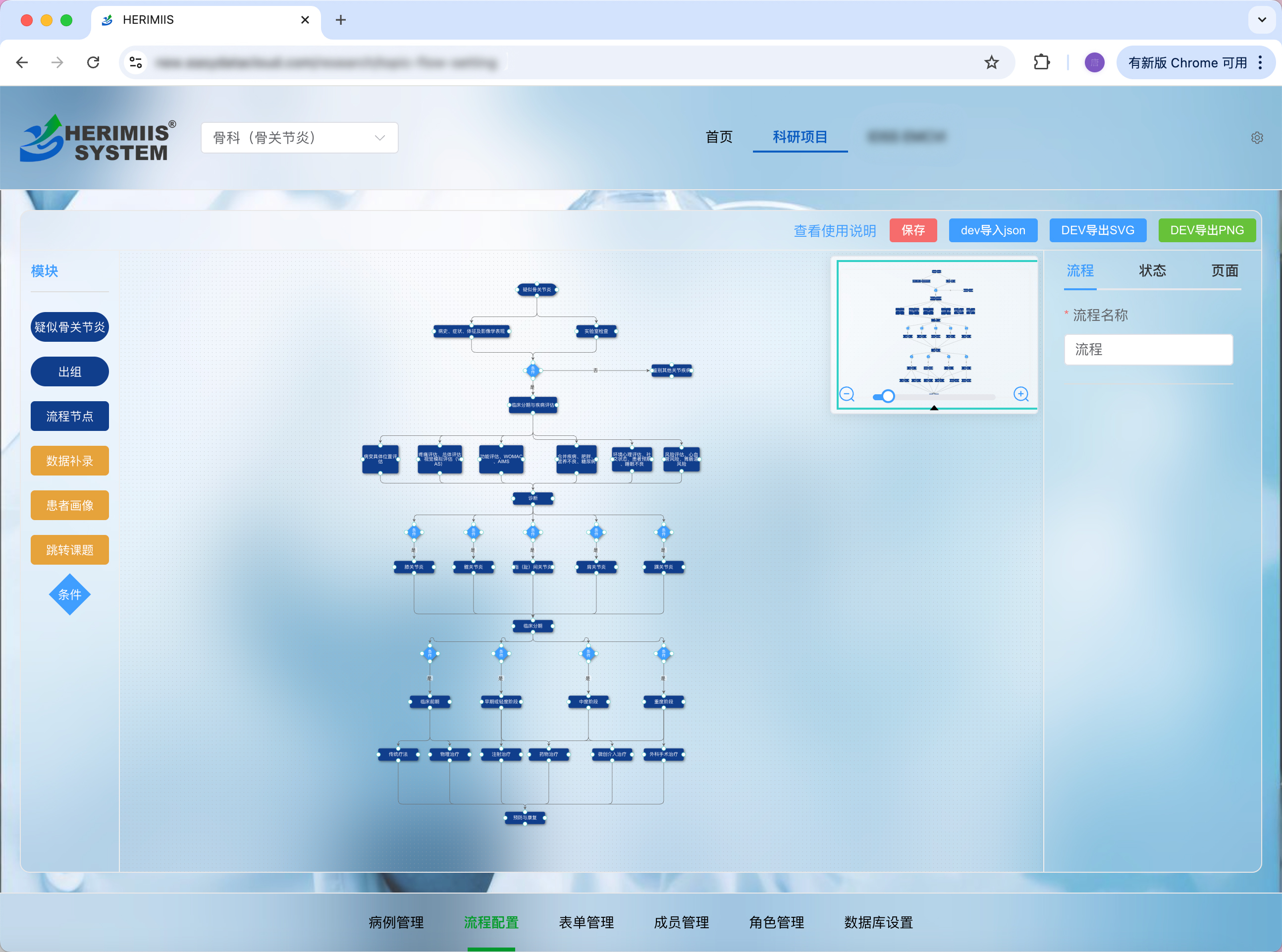 - 可视化流程构建:医生可通过拖拽方式自主搭建完整的诊疗路径,包括接诊、检查、评估、诊断、治疗、随访等关键节点,每个节点可挂接字段,便于后续科研数据采集与标准化管理。