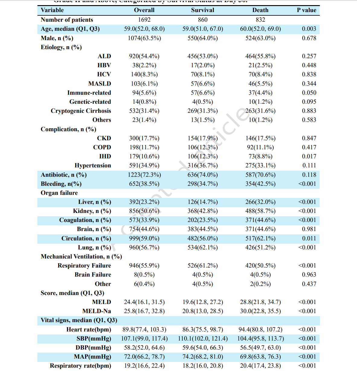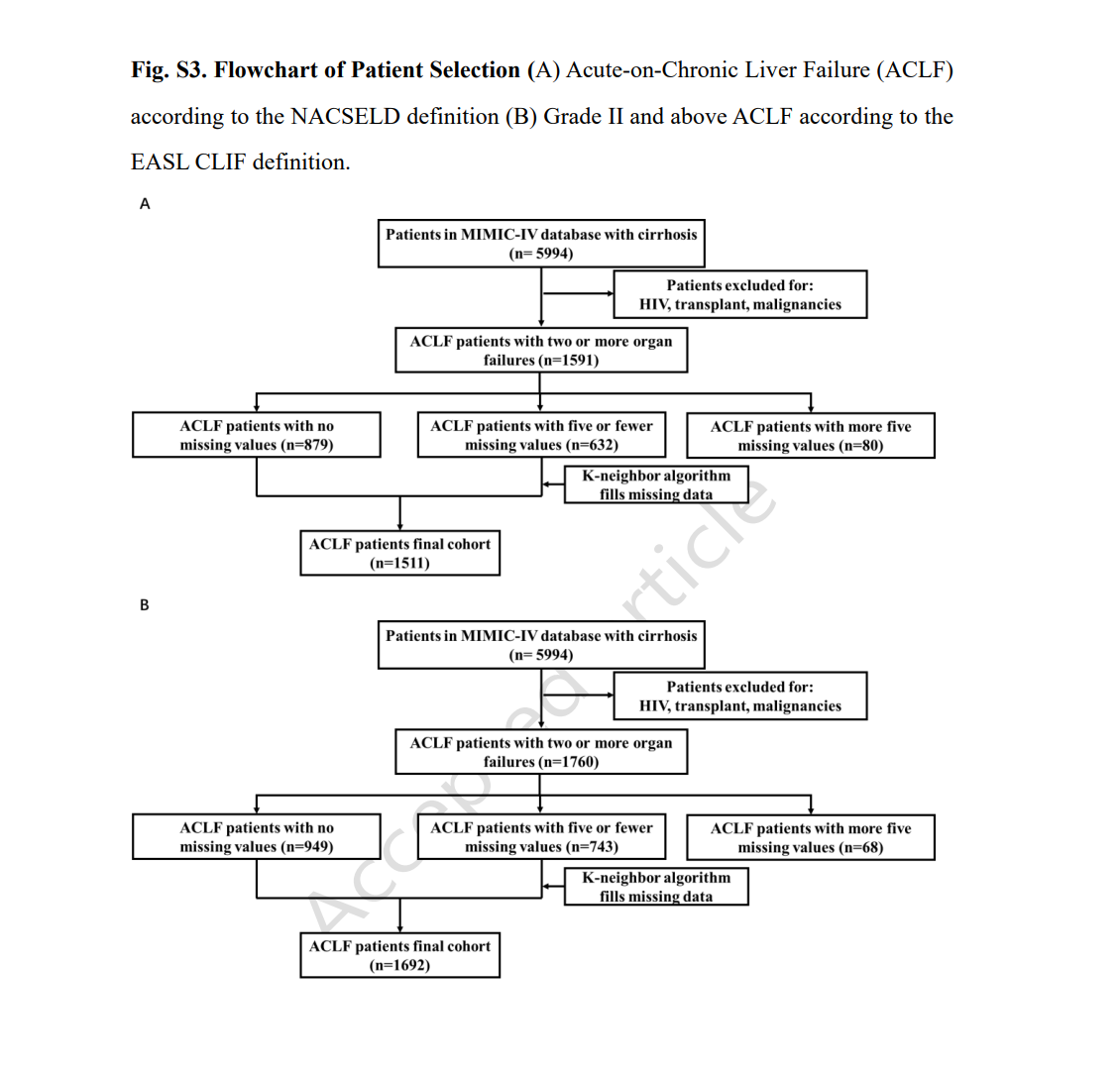 2. 患者定义: 研究同时采用EASL-CLIF和NACSELD两个主流标准来定义ACLF和器官衰竭,使研究结果更具普遍性和说服力。