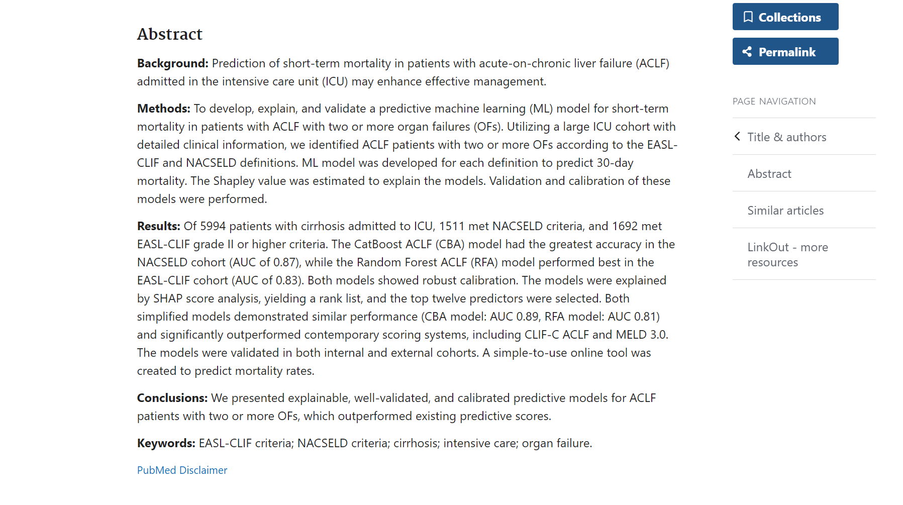 这项研究为我们提供了一个完美的范本:“聚焦明确临床问题(特定ACLF人群) + 利用成熟数据库(MIMIC-IV) + 应用机器学习建模(CatBoost等) + 使用SHAP进行可解释性分析 + 最终成果可视化、工具化”。