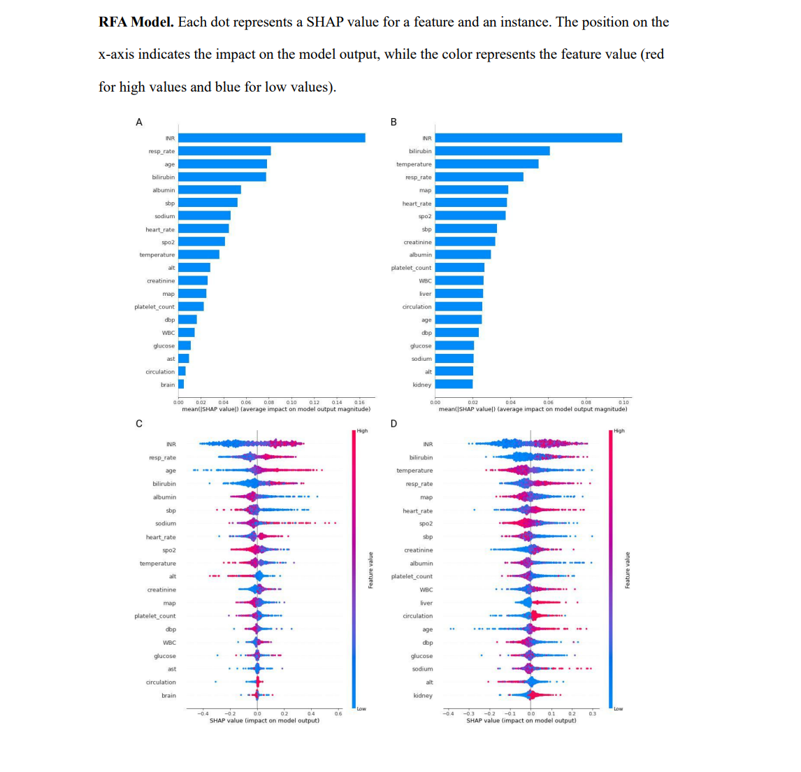 - 研究没有停留在“黑箱”预测,而是引入了SHAP(Shapley Additive exPlanations)值来解释模型。这意味着模型不仅能预测风险,还能清晰展示是哪些特征(如某个实验室指标、某种并发症)推高了死亡风险,以及影响的程度有多大。这正是临床医生所看重的。
