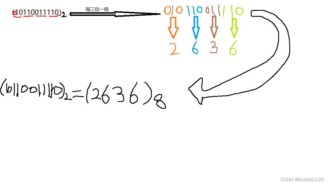 整数:从右向左,每三位一组(不足三位左补0)转换成八进制。