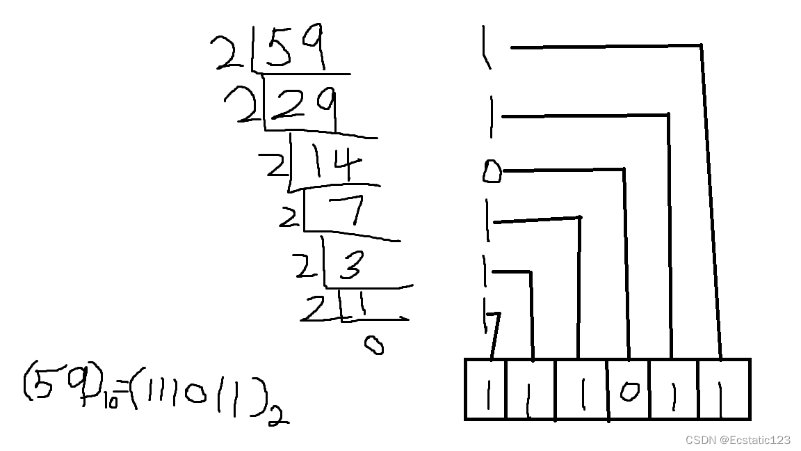 eg:把十进制数59转换成二进制。如图: