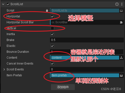 主代码仅有两个:ScrollList对应的滚动容器,ScrollListItem对应单项的预制体