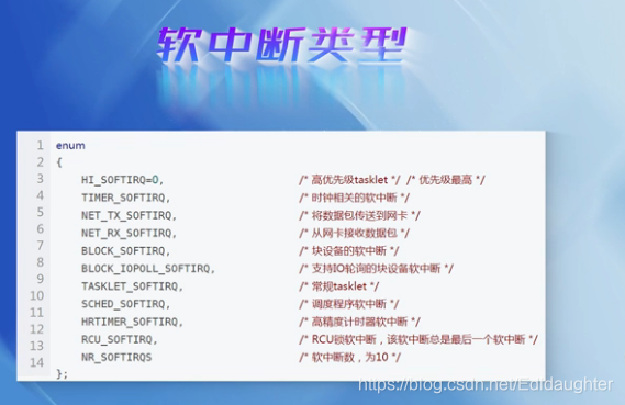 每个软中断在内核中都是以soft_irq_action来表示的,内核目前实现了10种软中断.