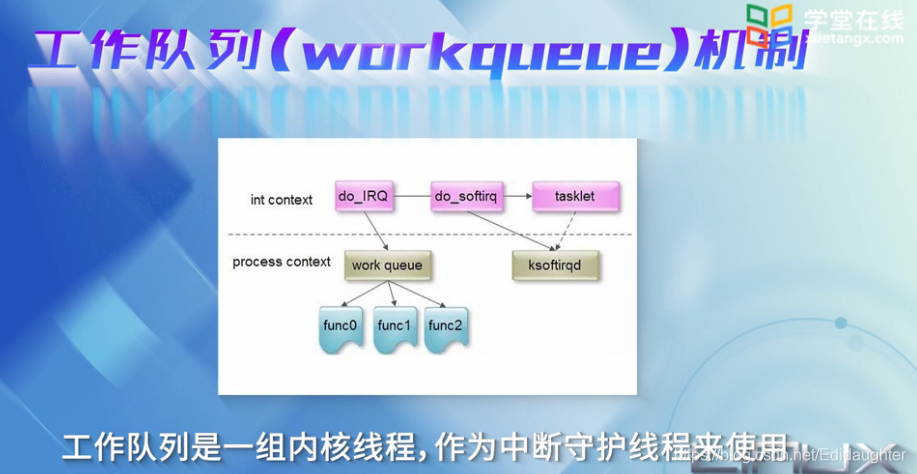 队列机制,工作队列说白了就是一组内核线程作为中断守护线程来使用,多个中断