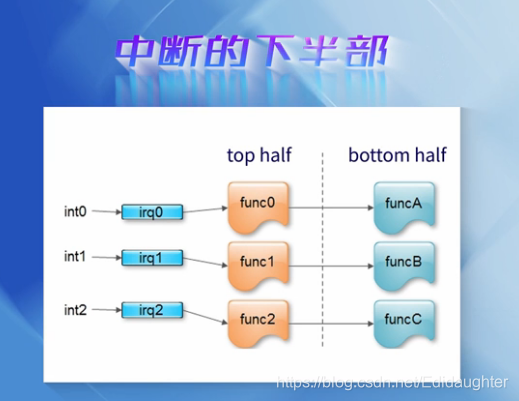 于是发生了中断丢失,这显然是不可以的,于是内核将中断分成两个部分,一个是上半部,这