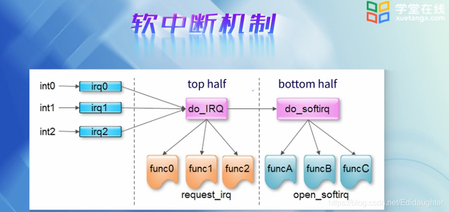添加下半部分处理函数,其执行是由do_softirq函数完成的,也就是软中断机制来完成的.