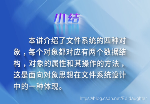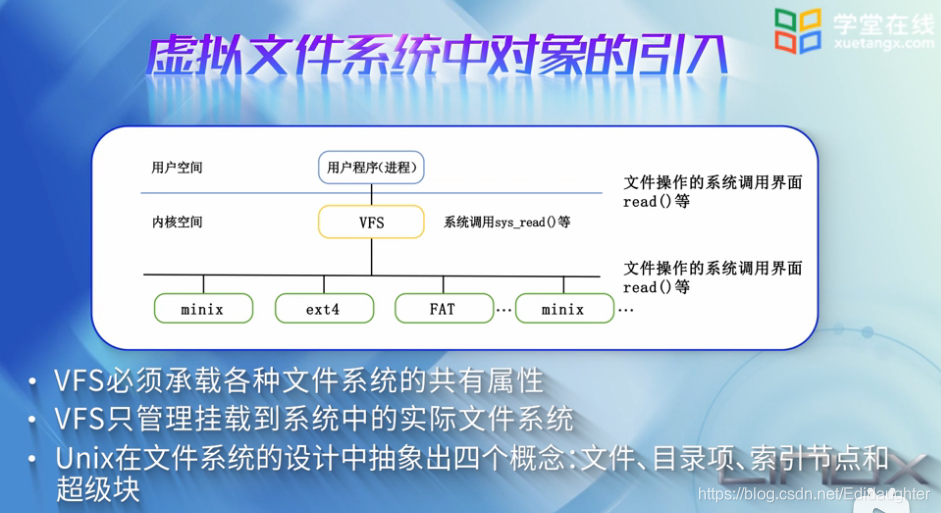 (1)超级块对象(superblock):存放系统中与安装文件系统的有关信息;