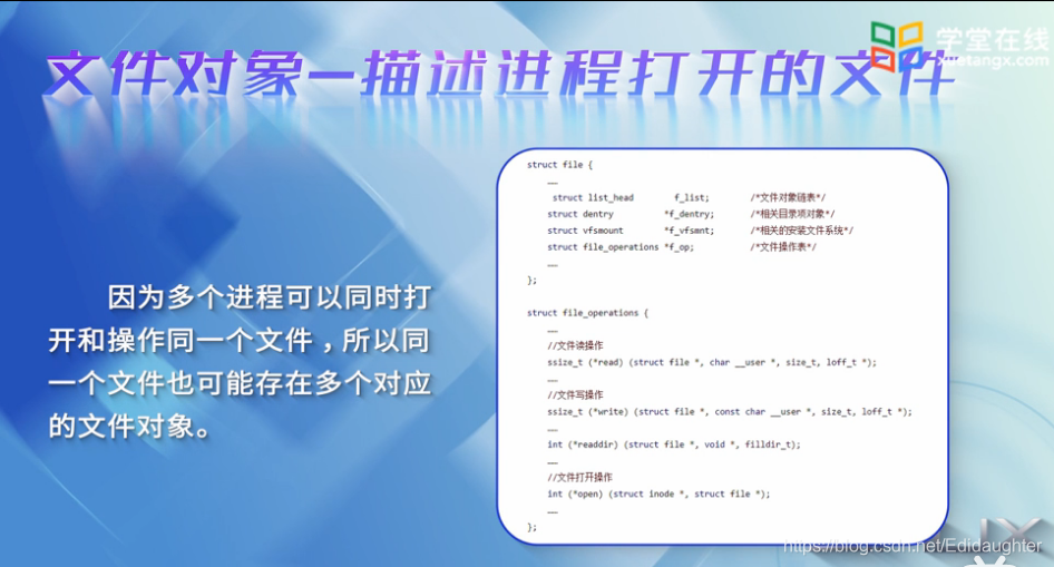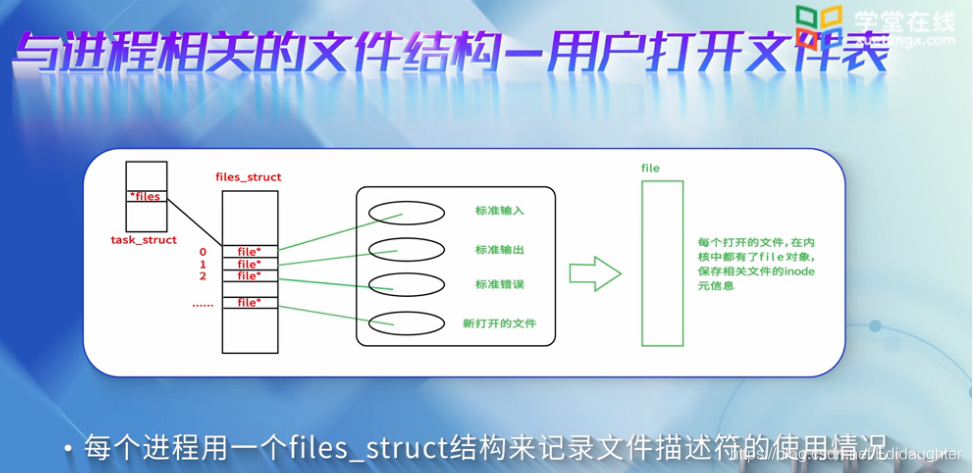 (2)文件对象(file):存放打开文件与进程之间进行交互的有关信息;