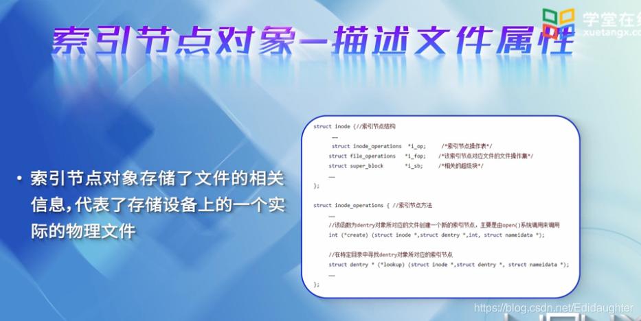 (3)索引节点对象(inode):存放关于具体文件的一般信息;