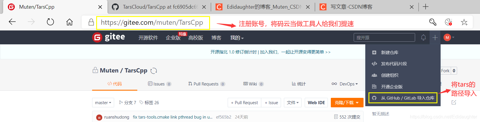 然后将https://github.com/TarsCloud/TarsFramework.git转到码云上,