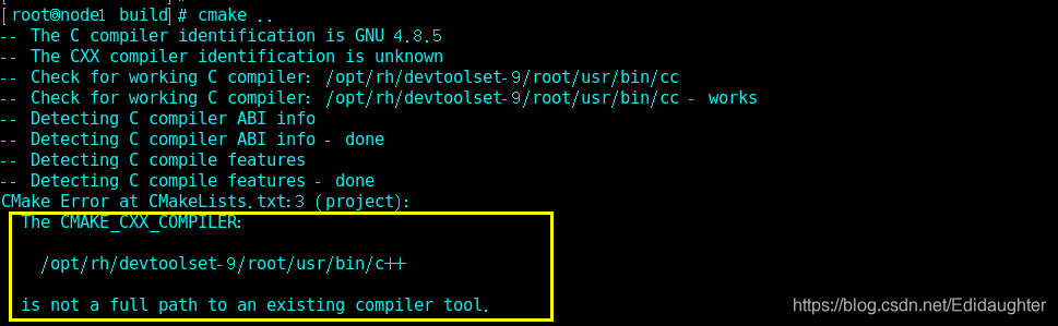 [root@node1 build]# ln -s /usr/bin/g++ /opt/rh/devtoolset-9/root/usr/bin/c++