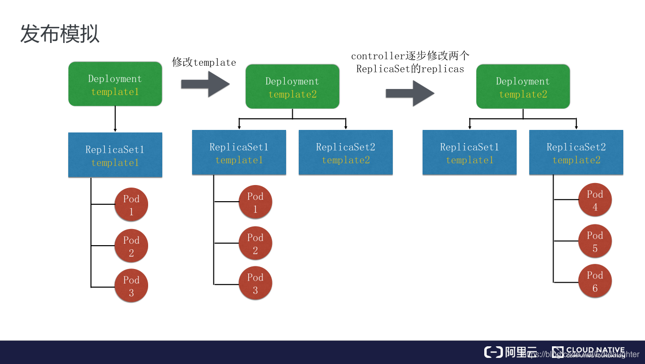 新,更新的方式其实也是通过 Create/Update/Delete 这种 ReplicaSet 来做实现的。