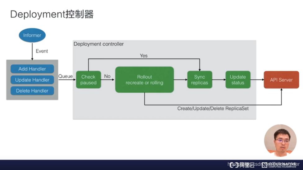 器,其实是关注 Deployment 和 ReplicaSet 中的 event,收到事件后会加入到队列中。而 Deployment