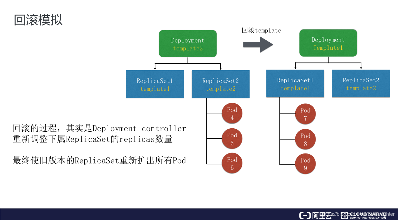 Pod9。就是说它的回滚并不是把之前的 Pod 重新找出来,而是说重新创建出符合旧版本 template 的 Pod。