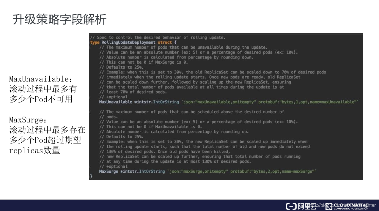 Deployment 在 RollingUpdate 中主要提供了两个策略,一个是 MaxUnavailable,另一个是 MaxSurge。这两个字段解析的意思,可以看下图中详细的 comment,或者简单解释一下: