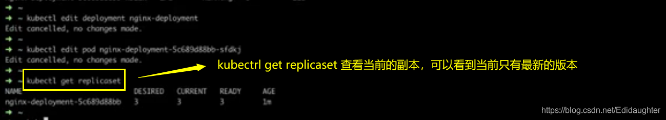 kubectl rollout undo deployment/nginx-deployment 回滚到当前部署的上一个版本