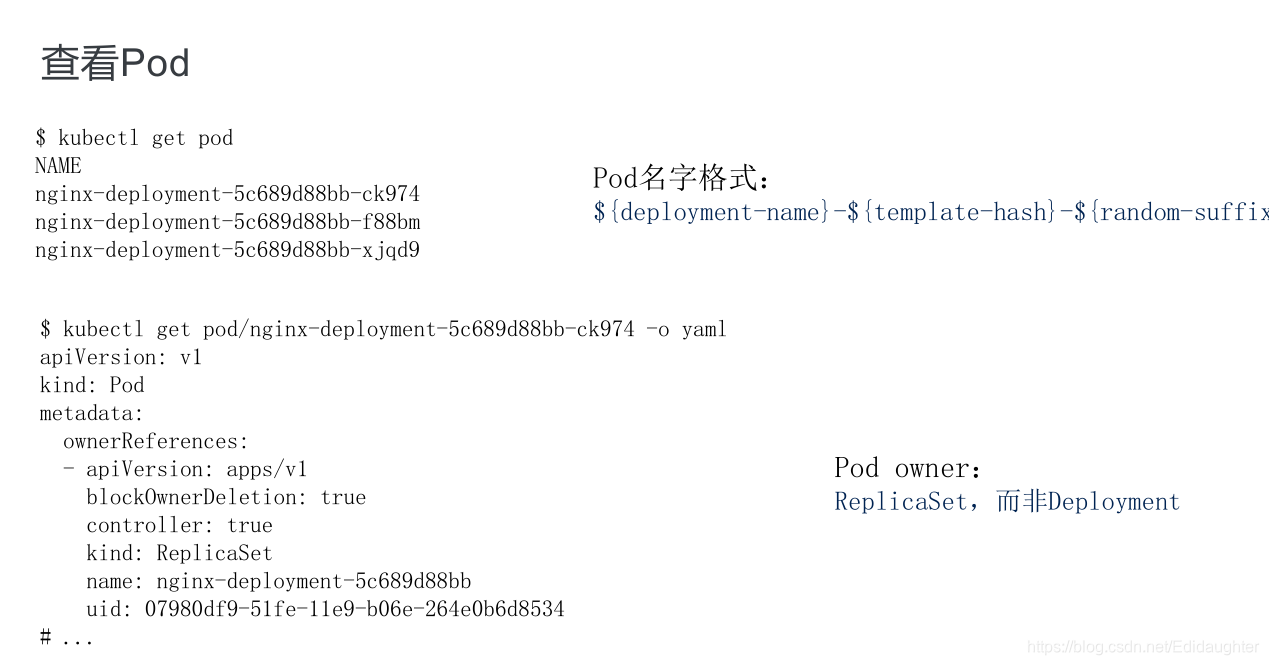 最后一段,是一个random的字符串,我们通过get.pod可以看到,Pod的ownerReferences即Pod所属的