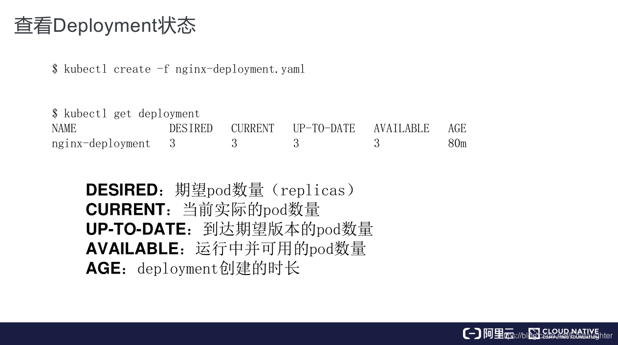 当我们创建出一个Deployment的时候,可以通过kubectl get deployment,看到Deployment总体的一个状态.