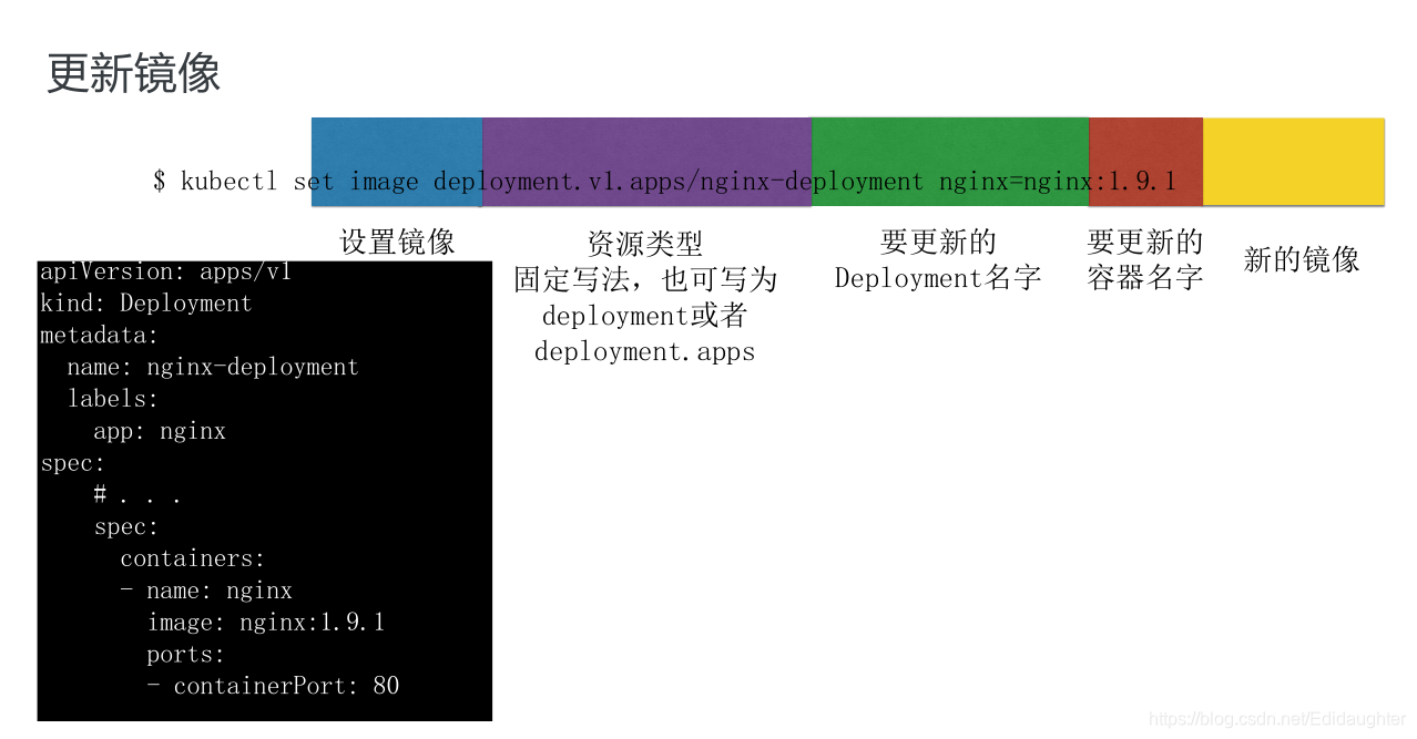 kubectl set image”这个操作命令,后面接“deployment”,加deployment.name,最后指定容器名,以及我