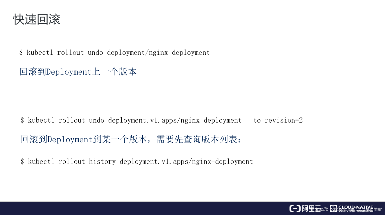 如果更新过程中发生问题的话,即所谓“一键”回滚,也就是说你通过一条命令或者一行修改能够将Deployment